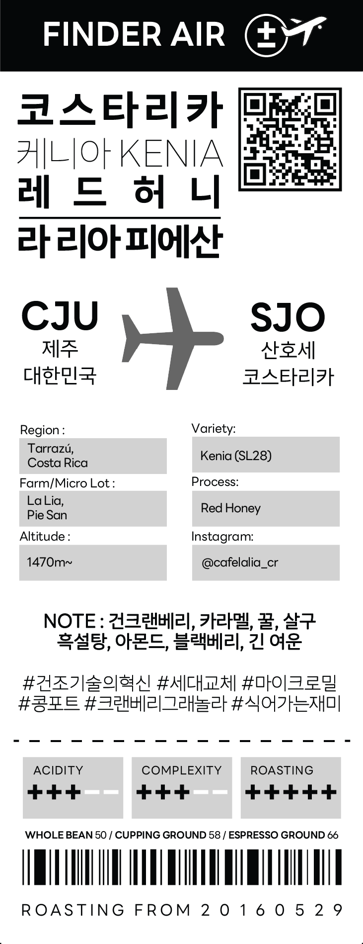 - 로스팅 : 중강배전 (Agtron: Whole Bean 50 / Cupping Ground 58 / Espresso Ground 66)