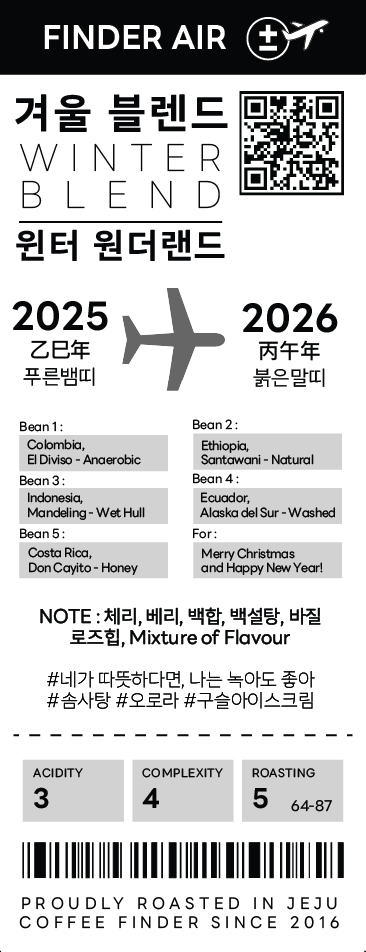 이번 겨울 블렌드, '윈터 원더랜드'는 커피들이 각자의 결을 지운 채 무채색으로 섞이는 것이 아니라, 서로의 존재를 인정하며 하나의 균형으로 겹쳐지길 바랐습니다.